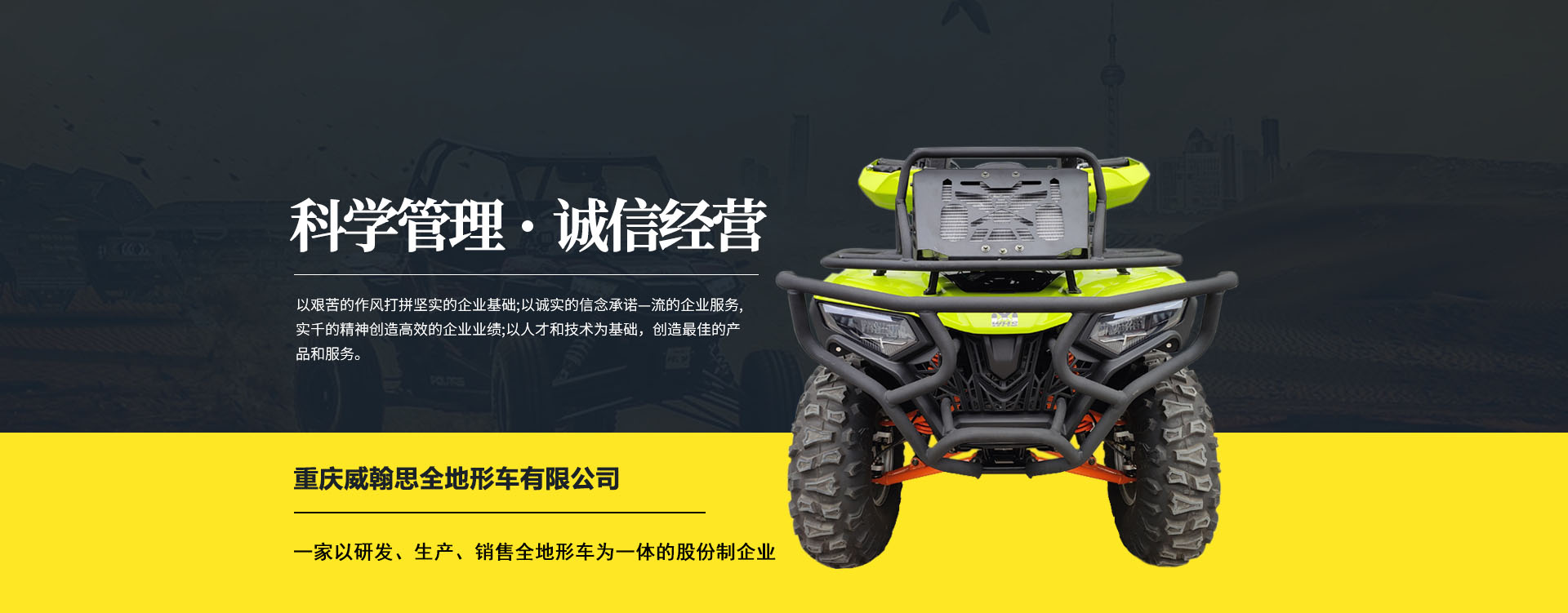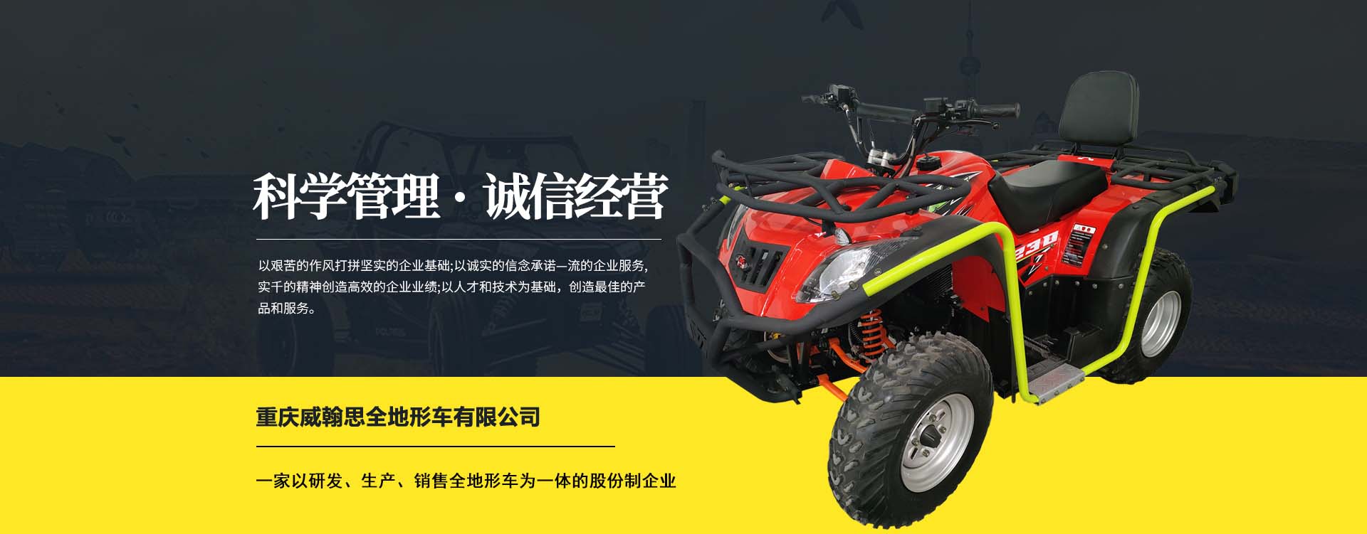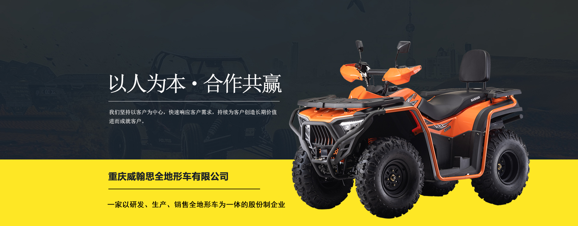 重慶威翰思全地形車(chē)有限公司成立于2016年9月,一家以研發(fā)、生產(chǎn)、銷(xiāo)售全地形車(chē)為一體的股份制企業(yè)。公司銷(xiāo)售額超過(guò)5000萬(wàn)。現(xiàn)有專(zhuān)業(yè)市場(chǎng)售后服務(wù)團(tuán)隊(duì)。公司秉承“敬業(yè)、超越、活力、用戶至上”的企業(yè)精神,“以人為本,合作共贏;”的核心價(jià)值觀,“嚴(yán)格管理創(chuàng)優(yōu)質(zhì)、名牌戰(zhàn)略拓市場(chǎng)”的質(zhì)量方針,使公司一步步邁上新的臺(tái)階。公司與重慶航天巴山摩托車(chē)制造公司達(dá)成戰(zhàn)略合作協(xié)議。共同出資致力于沙灘車(chē)旅游市場(chǎng)產(chǎn)品研發(fā),項(xiàng)自運(yùn)營(yíng)指導(dǎo),市場(chǎng)維護(hù)等全方位市場(chǎng)拓展。重慶航天巴山摩托車(chē)制造公司授權(quán);重慶威翰思全地形車(chē)有限公司為中國(guó)區(qū)唯─戰(zhàn)略合作伙伴。