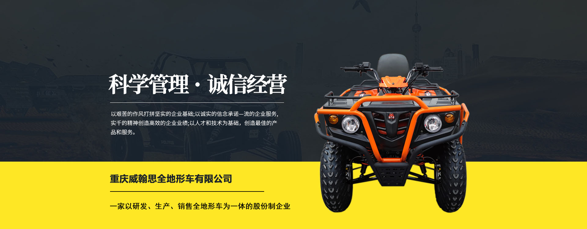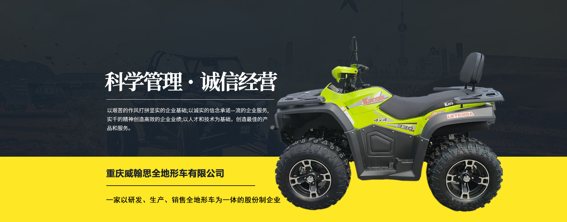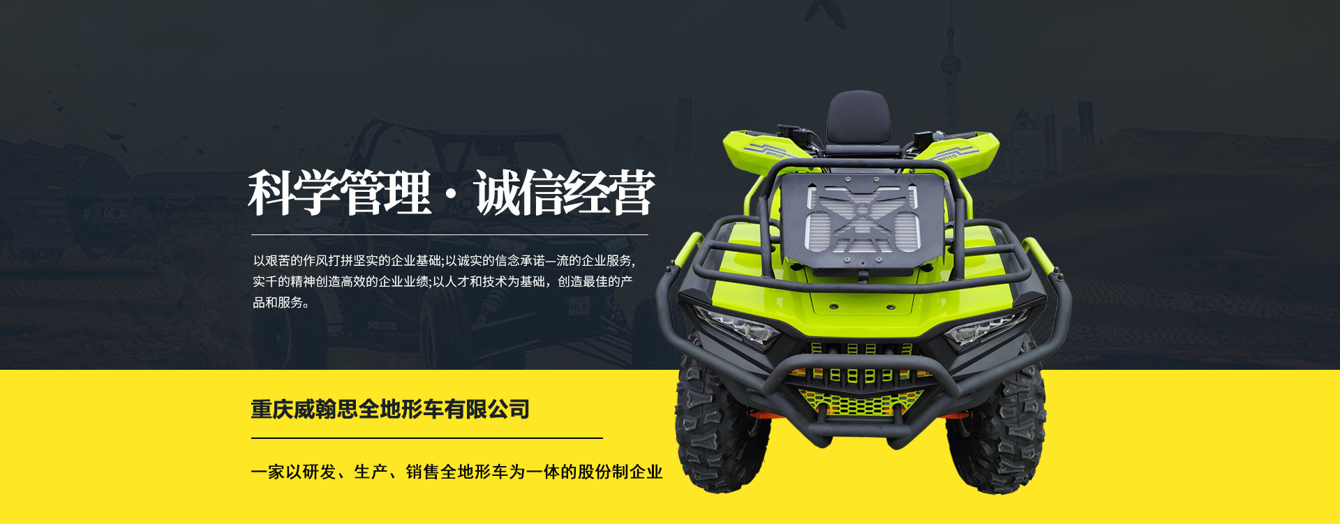 重慶威翰思全地形車(chē)有限公司成立于2016年9月,一家以研發(fā)、生產(chǎn)、銷(xiāo)售全地形車(chē)為一體的股份制企業(yè)。公司銷(xiāo)售額超過(guò)5000萬(wàn)。現(xiàn)有專(zhuān)業(yè)市場(chǎng)售后服務(wù)團(tuán)隊(duì)。公司秉承“敬業(yè)、超越、活力、用戶至上”的企業(yè)精神,“以人為本,合作共贏;”的核心價(jià)值觀,“嚴(yán)格管理創(chuàng)優(yōu)質(zhì)、名牌戰(zhàn)略拓市場(chǎng)”的質(zhì)量方針,使公司一步步邁上新的臺(tái)階。公司與重慶航天巴山摩托車(chē)制造公司達(dá)成戰(zhàn)略合作協(xié)議。共同出資致力于沙灘車(chē)旅游市場(chǎng)產(chǎn)品研發(fā),項(xiàng)自運(yùn)營(yíng)指導(dǎo),市場(chǎng)維護(hù)等全方位市場(chǎng)拓展。重慶航天巴山摩托車(chē)制造公司授權(quán);重慶威翰思全地形車(chē)有限公司為中國(guó)區(qū)唯─戰(zhàn)略合作伙伴。